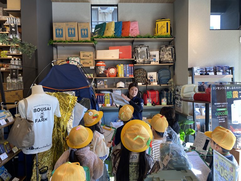行われているとの事です。この日は前半と後半合わせて19人の生徒さんが防災ファームにご来店されました。